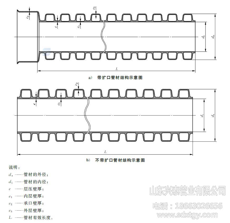 產(chǎn)品名稱:HDPE雙壁波紋管,聚乙烯雙壁波紋管 材料材質(zhì):PE/聚乙烯 執(zhí)行標(biāo)準(zhǔn):GB/T 19472.1 規(guī)格型號(hào):DN/ID160-500mm(內(nèi)徑系列) 環(huán)剛度等級(jí):SN4,SN8 外觀顏色:外觀內(nèi)壁均為黑色 產(chǎn)品長(zhǎng)度:6米/支 連接方式:彈性密封圈 生產(chǎn)廠家:山東興泰管業(yè)有限公司 聯(lián)系電話:186 6302 6656 (高經(jīng)理) 適用溫度:長(zhǎng)期使用溫度45℃以下的埋地排水、排污和通訊護(hù)套管用管材 產(chǎn)品介紹: HDPE雙壁波紋管,簡(jiǎn)稱PE波紋管,80年代初在德國(guó)首先研制成功,是一種以聚乙烯PE為原材料,經(jīng)過擠出和特殊的成型工藝加工而成,內(nèi)壁光滑,外壁為封閉波紋型的一種新型輕質(zhì)管材,因采用了特殊的中空環(huán)形結(jié)構(gòu),具有優(yōu)異的環(huán)剛度和良好的強(qiáng)度與韌性。具有重量輕、耐高壓、韌性好、施工快、壽命長(zhǎng)、摩擦系數(shù)小、連接方便可靠等特點(diǎn)。其優(yōu)異的管壁結(jié)構(gòu)設(shè)計(jì),與其它結(jié)構(gòu)的管材相比,成本大大降低。雙壁波紋管已成為管道領(lǐng)域“以塑代鋼”的首選管材,它克服了混凝土管,鑄鐵管等安裝難度大、易銹蝕、水流阻力大、滋生細(xì)菌、壽命短的缺點(diǎn)。 PE雙壁波紋管是為了在節(jié)省原材料而不致使管材的環(huán)剛度下降的前提下,對(duì)管材截面進(jìn)行優(yōu)化設(shè)計(jì)的一種內(nèi)壁光滑平整、外壁為梯形或弧形波紋狀、內(nèi)外壁波紋間為中空、采用擠出成型工藝制成的管材。因?yàn)槠渲饕牧蠟榫垡蚁≒E),故簡(jiǎn)稱為PE雙壁波紋管。 PE雙壁波紋管內(nèi)徑系列管材尺寸(單位:mm) 公稱內(nèi)徑 DN/ID 最小平均內(nèi)徑 dim,min 最小層壓壁厚 emin 最小內(nèi)層壁厚 e1,min 最小外層壁厚 e3,min 最小結(jié)合長(zhǎng)度 Amin 200 195 1.5 1.1 0.9 54 300 294 2.0 1.7 1.0 64 400 392 2.5 2.3 1.8 85 500 490 3.0 3.0 2.1 96 PE雙壁波紋管的優(yōu)點(diǎn) : 1、 產(chǎn)品結(jié)構(gòu)獨(dú)特,抗壓能力強(qiáng),具有足夠安全可靠的環(huán)剛度; 2、 節(jié)約原材料,用同樣的原材料做同一外徑的管材時(shí),波紋管比實(shí)壁管節(jié)省30%以上的原材料; 3、 重量輕,比重小于鑄鐵管和水泥管的50%; 4、 內(nèi)壁表面光滑,不易產(chǎn)生沉積,摩擦系數(shù)小; 5、 PE雙壁波紋管采用柔性密封圈連接,密封性能好,耐腐蝕,不結(jié)垢; 6、 具有良好的撓曲心梗,可適應(yīng)土壤的不均勻沉降; 7、 連接便捷、施工進(jìn)度快,與傳統(tǒng)水泥管相比,采用PE波紋管可以提高3倍以上安裝進(jìn)度,明顯降低施工費(fèi)用,縮短施工周期; 8、 生產(chǎn)成本低,埋地使用可達(dá)50年以上,綜合經(jīng)濟(jì)性能優(yōu)越。 PE雙壁波紋管的物理力學(xué)性能 項(xiàng)目 要求 環(huán)剛度/(kN/m2) SN4 SN8 ≥4 ≥8 沖擊性能(TIR)/ % ≤10 環(huán)柔性 管材無破裂,兩壁無脫開,內(nèi)壁無反向彎曲 烘箱試驗(yàn) 無分層,無開裂 密度/(kg/m3) ≤1180 氧化誘導(dǎo)時(shí)間(200℃)/min ≥20 蠕變比率 ≤4 PE雙壁波紋管的應(yīng)用領(lǐng)域 : 1、 市政工程,用于建筑物的地下排水管、排污管、輸水管、通風(fēng)管等; 2、 公寓、住宅小區(qū)、農(nóng)村地下埋設(shè)排水排污; 3、 電器電信工程,作為電力電纜、通訊光纜、通訊信號(hào)電纜的保護(hù)管; 4、 工業(yè),由于聚乙烯材料具有優(yōu)良的耐酸、堿及耐腐蝕能力,結(jié)構(gòu)壁管可用于化工、醫(yī)藥、環(huán)保等行業(yè)的給水和排水管道; 5、 農(nóng)業(yè)、園林工程,用于農(nóng)田、果園、茶園以及林帶排灌,可節(jié)水70%,節(jié)約用電13.9%,也可用于農(nóng)村灌溉; 6、 道路工程,可用作鐵路、高速公路、高爾夫球場(chǎng)、足球場(chǎng)等的滲、排水管; 7、 礦場(chǎng),用作礦井的通風(fēng)、送風(fēng)管、排水管。 PE雙壁波紋管的連接: HDPE雙壁波紋管管道接頭應(yīng)采用彈性密封橡膠圈連接的承插式接口,橡膠圈接口應(yīng)遵守下列規(guī)定: 1、接口前,應(yīng)先檢查橡膠圈是否配套完好,確認(rèn)橡膠圈安放位置及插口的插入深度。 2、接口時(shí),先將承口的內(nèi)壁清理干凈,并在承口內(nèi)壁及插口橡膠圈上涂潤(rùn)滑劑,然后將承插口端面的中心軸線對(duì)齊。 3、接口方法應(yīng)按下述程序進(jìn)行:DN400及其以下管道,先由一人用棉紗繩吊住被安裝管道的插口,另一人用長(zhǎng)撬棒斜插入基礎(chǔ),并抵住該管端部中心位置的橫擋板,然后用力將該管緩緩插入待安裝HDPE雙壁波紋管管道的承口至預(yù)定位置;DN400以上管道可用兩臺(tái)手扳葫蘆將管節(jié)拉動(dòng)就位。接口合攏時(shí),管節(jié)兩側(cè)的手扳葫蘆應(yīng)同步拉動(dòng),使橡膠密封圈正確就位,不扭曲、不脫落。 PE雙壁波紋管貯存方法: HDPE雙壁波紋管應(yīng)貯存于常溫干燥庫中,不宜暴曬。 HDPE雙壁波紋管應(yīng)平放,堆碼高度不得超過4m。 HDPE雙壁波紋管不允許與有毒有害物質(zhì)混放,應(yīng)遠(yuǎn)離熱源,在存放處應(yīng)設(shè)置醒目的禁火標(biāo)志。 存放期自生產(chǎn)之日起,一般不得超過2年。
